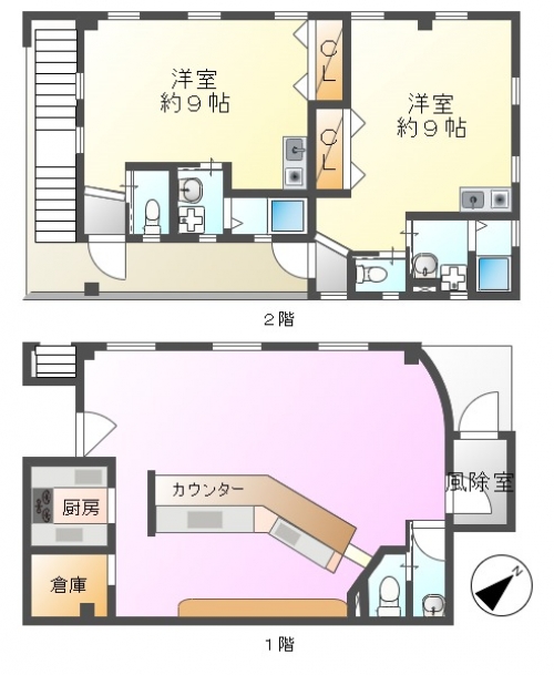 | 間取り | 1F:店舗 2F:1R×2戸 | 接道状況 | 北西側 公道(30m) | 建ぺい率 | 80% |
